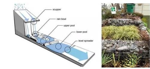 對于不適用綠色屋頂?shù)奈菝妫部梢酝ㄟ^排水溝、雨水鏈等方式收集引導(dǎo)雨水進行貯蓄或下滲。