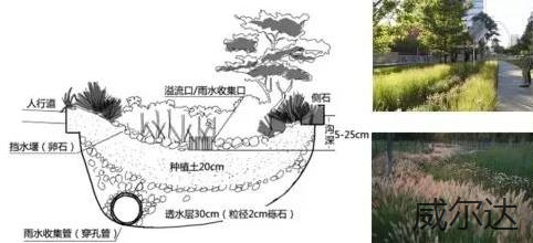是指在園林綠地中種有樹木或灌木的低洼區(qū)域,由樹皮或地被植物作為覆蓋。它通過將雨水滯留下滲來補充地下水并降低暴雨地表徑流的洪峰,還可通過吸附、降解、離子交換和揮發(fā)等過程減少污染。其中淺坑部分能夠蓄積一定的雨水,延緩雨水匯集的時間, 土壤能夠增加雨水下滲,緩解地表積水現(xiàn)象。蓄積的雨水能夠供給植物利用,減少綠地的灌溉水量。