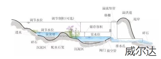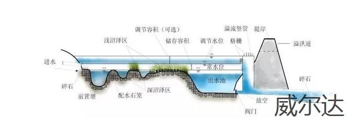 雨水濕地人工雨水濕地是一個綜合的生態(tài)系統(tǒng),它應(yīng)用生態(tài)系統(tǒng)中物種共生、物質(zhì)循環(huán)再生原理,結(jié)構(gòu)與功能協(xié)調(diào)原則,將雨水花園、生態(tài)滯留池收集的雨水進行集中的凈化。而且其具有緩沖容量大、處理效果好、工藝簡單、投資省、運行費用低等特點,極其適合海綿城市建設(shè)中多出應(yīng)用。