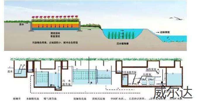人工濕地凈化:分為2個處理過程,一是初級凈化池,凈化未經(jīng)土壤滲濾的雨水;二是次級凈化池,進一步凈化初級凈化池排出的雨水,以及經(jīng)土壤滲濾排出的雨水;經(jīng)二次凈化的雨水排入下游清水池中,或用水泵直接提升到山地貯水池中。初級凈化池與次級凈化池之間、次級凈化池與清水池之間用水泵進行循環(huán)。