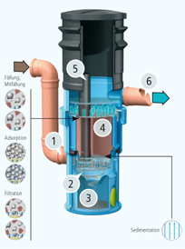 工作原理1. 排水區(qū)域的雨水被排到位于豎井底端的入口,導(dǎo)流板的設(shè)置可形成徑向流。2. 沉積的顆粒,尤其是沙粒部分,是在水動(dòng)力分離器中產(chǎn)生。這是因?yàn)槎螐较蛄鞯奈蓜?dòng) 的作用形成。3. 通過淤泥室收集固體顆粒 , 淤泥室可通過旁路中心管間隙縫進(jìn)行定期排空淤泥。4. 四個(gè)過濾芯位于過濾器豎井中. 向上的水流可將細(xì)小的顆粒過濾出來,同時(shí),溶解態(tài) 污染物也可沉淀并被吸收。該過濾器便于回洗,如果出現(xiàn)完全堵塞或使用功能衰竭 都可很方便的進(jìn)行更換。5. 雍水管和緊急排水管6. 被凈化的雨水通過此處被排放到地表或雨水儲(chǔ)存器里。