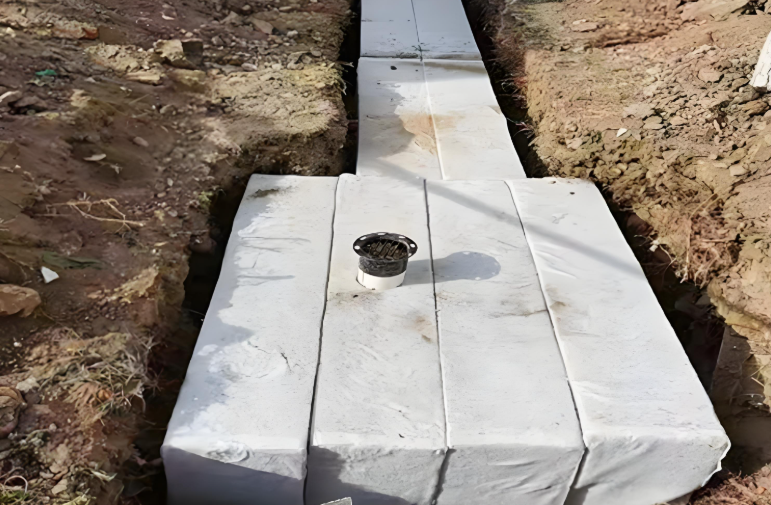 碳纖維雨水收集模塊一般采用塊狀,為了保持整體性,避免局部損壞,其塊狀外部封閉包裹有無紡布,在需要安裝位置挖設(shè)預(yù)埋坑,將一組多孔纖維棉放入預(yù)埋坑中,碳纖維雨水收集模塊中還設(shè)置有貫穿通孔,然后通過集雨管道伸入貫穿通孔中將所有碳纖維雨水收集模塊進(jìn)行連接,伸入貫穿通孔部分的集雨管道圓周上設(shè)置有漏雨孔,當(dāng)降雨條件下,雨水通過土地滲入碳纖維雨水收集模塊,同時,雨水經(jīng)過集雨管道并通過漏雨孔滲入碳纖維雨水收集模塊中,碳纖維雨水收集模塊將雨水吸收并且在非降雨條件下逐漸將吸收的雨水釋放至周圍土壤中,使得周圍土壤在非降雨時期也能夠保持一定的含水量,為土壤的水份保持提供技術(shù)支撐。